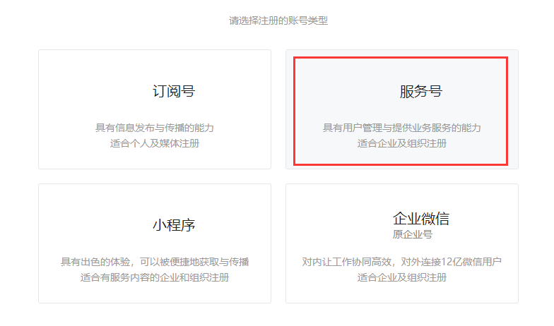 2、選擇公眾號的注冊賬號類型,主要分服務號和訂閱號,這里以服務號為例
