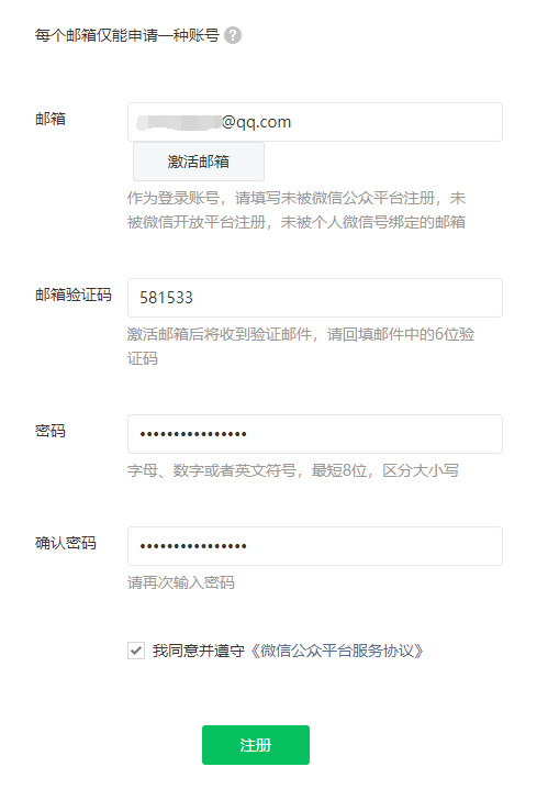 3、用從未注冊過微信公眾號的郵箱賬號來注冊,會發送激活碼到郵箱,輸入激活碼和密碼,就能注冊成功公眾號