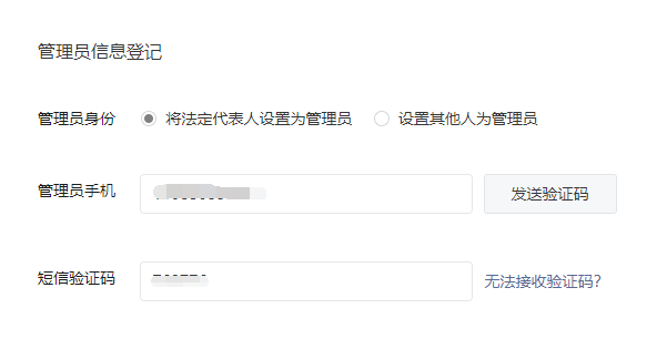 6、管理員信息登記,可以是法人,也可以是法人授權的管理員,輸入手機號碼和驗證碼