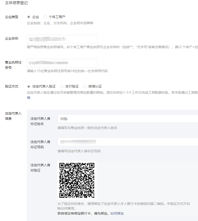 5、主體信息登記,按照營業執照上的信息來填,公司名稱還有營業執照號碼,然后法人掃碼驗證