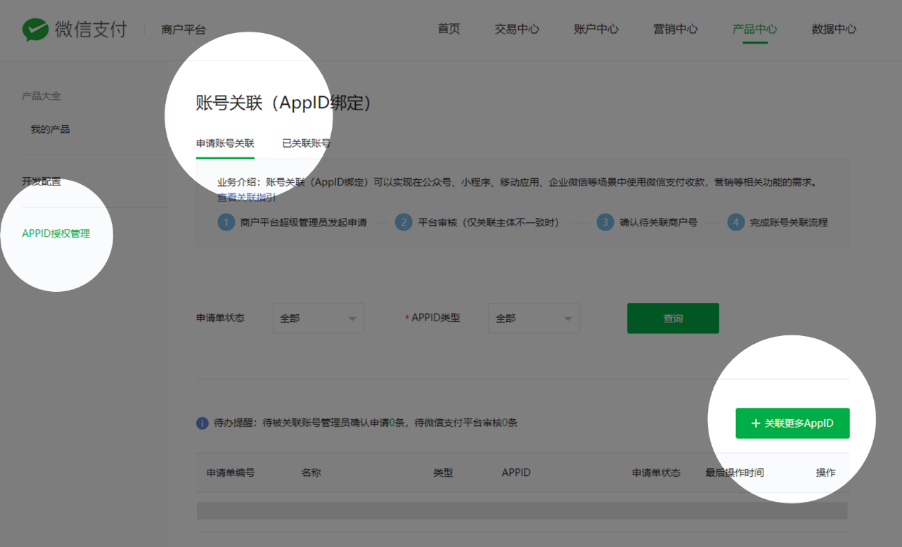 1. 登錄商戶平臺-產品中心-賬號關聯(AppID綁定),進入授權申請頁面;