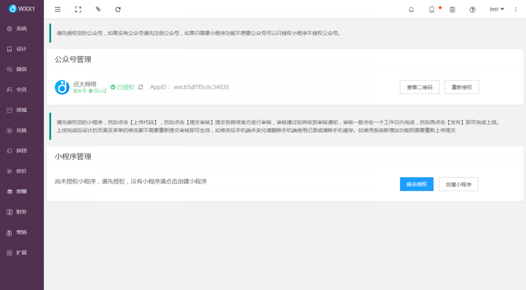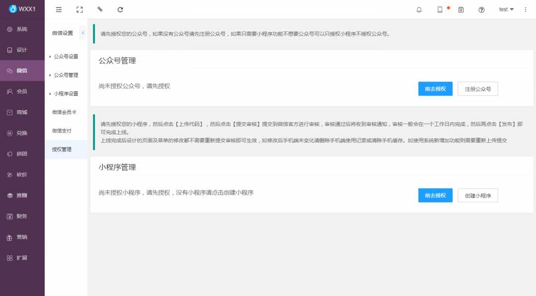 1、在本平臺(wxx1.com)【微信】-【授權管理】-【小程序管理】中點擊前往授權